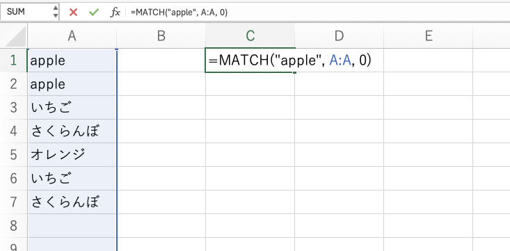 A列に「apple」が含まれる最初のセルの位置が返されます。