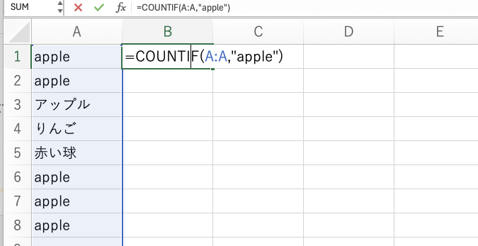 例えば、A列にデータがあり、その中で「apple」という値がいくつあるかを数える場合、次のように入力します。