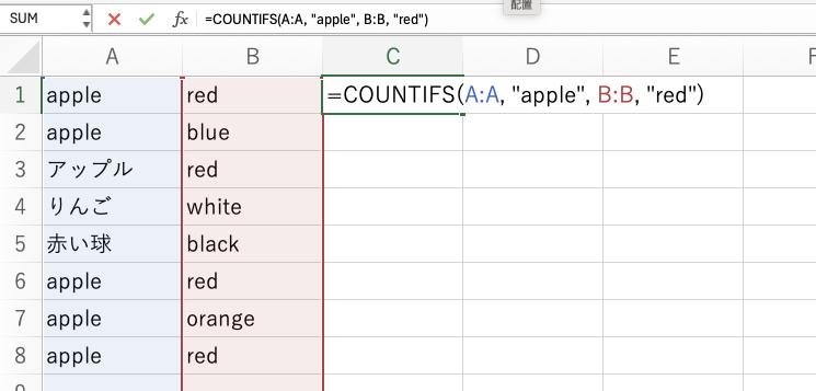 例えば、A列に「apple」が含まれ、B列に「red」が含まれるセルの数を数えたい場合、次のように入力します。