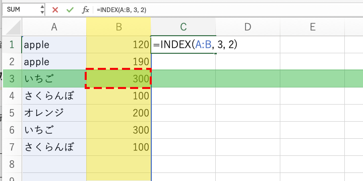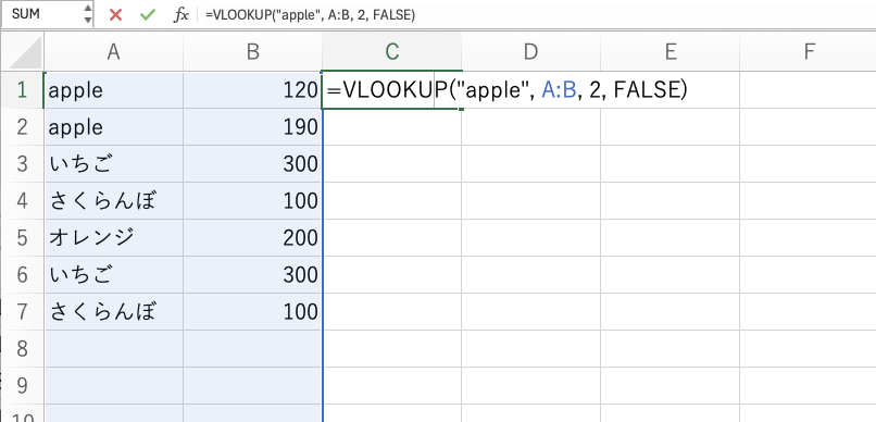 A列に「apple」が含まれ、その右隣のB列の値が返されます。